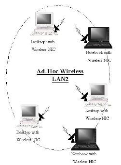 Itt arról van szó, hogy egyik számítógép sem rendelkezik vezetékes hálózati kapcsolattal. Az adatátvitelt rádióhullámok segítségével valósítjuk meg. Az ábra nagyon jól szemlélteti, hogy nem csak két, hanem több gépet is összekapcsolhatunk ezzel a módszerrel. De egy gép csak akkor tud a másikhoz kapcsolódni, ha hatótávolságon belül van. Hiába van két távoli gép között egy harmadik, az átjátszóként nem üzemelhet!