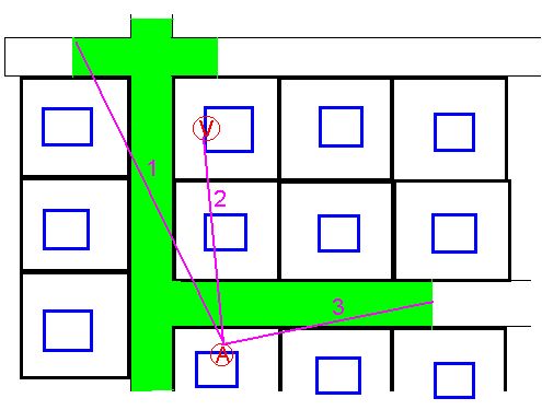 Ez egy helyszínrajz lenne... A vastag fekete négyzetek a telkeket jelölik, a kékek a házakat. A Router az "A" jelzésû pontban egy ház ablakában volt. A "V" betûvel megjelölt házba elvittem egy laptopot benne az Edimax rádiós hálózati kártyával. A 2-es számmal jelzett távolság úgy 60 méter lehetett. Csak a beépített antennákat használtam.