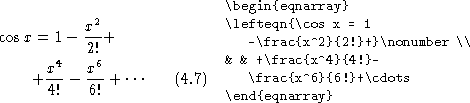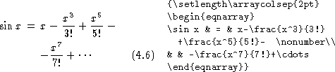 Mint már említettem, a hosszú képleteket több sorba kell törni. Két módszert mutatok ennek a feladatnak a megoldására, ezek lényegében azonosak. Bonyolultabb, nagyobb képleteknél megint csak célszerűbb az AmSLaTeX használata. Ez a csomag több új környezetet definiál erre a célra teljes megoldást adva a problémára.