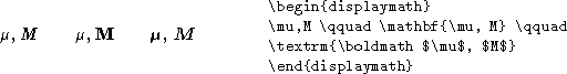 Az AmSLaTeX csomag új parancsokat definiál kövér betűk és jelek írására, ezzel a példában használt bonyolult szerkezet feleslegessé válik, lásd az AmSLaTeX leírását!
