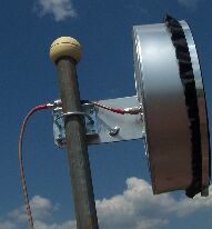 Az antenna többféleképpen felszerelhető. A kerek lavor (28cm) antennánál (ez nem parabola antenna!!!) a peremén van egy kis lyuk. Ennek lefele kell lennie, hogy ha mégis bejutna némi nedvesség, akkor az távozni tudjon. Ekkor az antenna függőleges polarizációban ad. Ha a másik antenna egy rácsos antenna, akkor azt az előző képhez képest 90 fokkal elfordítva kell felszerelni, úgy, hogy a hosszabbik oldala vízszintes legyen.