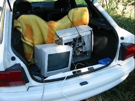 A gép és a monitor a csomagtartóban. Az elsősegély doboz volt az egérpad, a kocsi alatt volt az UPS és mellette az akkumulátor. Pár helyen megálltunk én feltartottam jó magasra az antennát (a lehetőségekhez képest), beállítottam az irányt, a kollega közben rábírta a PC-t a Windows 2000-es boot-ra és elkezdte "pingelni" a másik állomást. Mondanom sem kell, aki így látott minket, az pár percre "lefagyott mellettünk és gyökeret eresztett", valószínűleg fél óra alatt népes tábort tudtunk volna összegyűjteni :-)