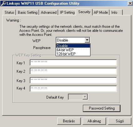 64 illetve 128 bites titkosítást használhatunk. Így aki nem ismeri az itt megadott kulcsokat, annak gyakorlatilag nincs esélye betörni a hálózatba.