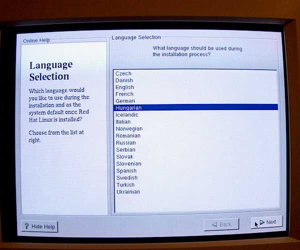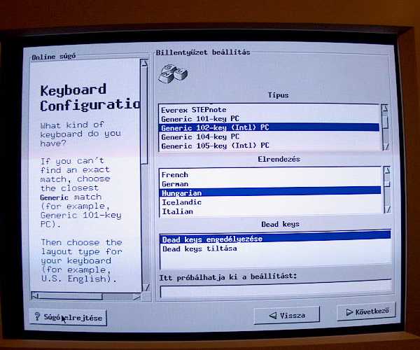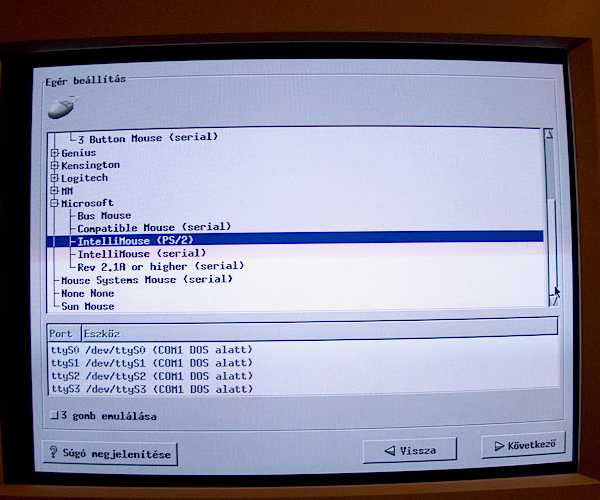 Először is a három alapvető dolgot tisztázni kell - milyen nyelven szeretnéd a telepítést végrehajtani, és a hardware megfelelő kezelése érdekében meg kell adnod a billentyűzet kiosztását és az egér típusát, csatlakozását (mivel én használni akartam az egerem scroll-görgőjét, ezért az intellimose típusú egeret választottam).