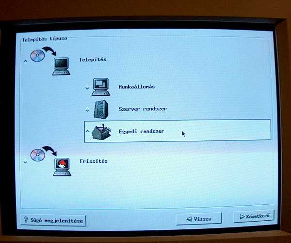 Namost, én mint írtam, a RedHat Linux 7.0 disztrib Server változatát installáltam - a "sima" verziónál nem tudom hogy van, nem biztos hogy a telepítés típusai ezek lehetnek. Mindenesetre nem túl bonyolult a dolog... : )