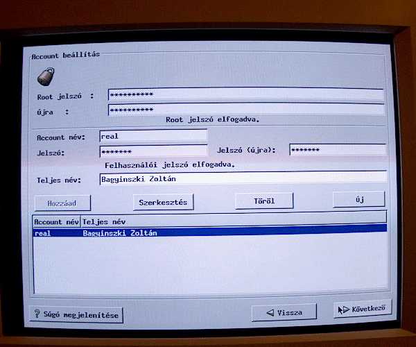 Minden Linux rendszernek van egy rendszergazdája (őt hívják root -nak), aki az egész rendszer felett rendelkezik. Ő a király! : ) Miután megadtad a jelszavát, hozz létre egy új felhasználót. Nem kötelező most, de a loginolás után hozz létre felhasználót. Soha de soha, érted, soooohaaaa ne root -ként dolgozz a gépeden, azt csak adminisztrálásra, a rendszer karbantartására, beállítására használd! Nagyon fontos, sok kellemetlenségtől megóvod így magad. Hozz létre felhasználót, és "alatta" dolgozz.