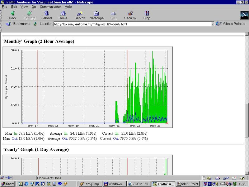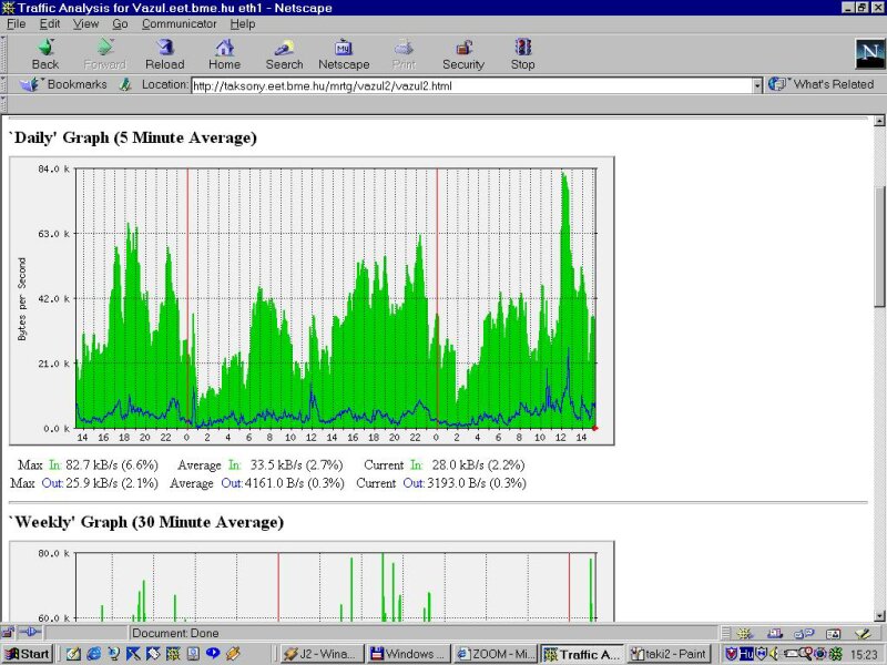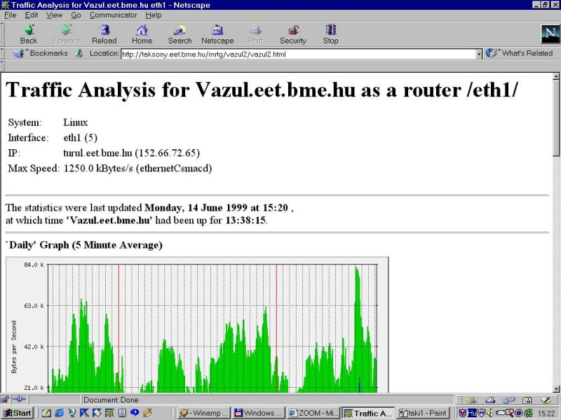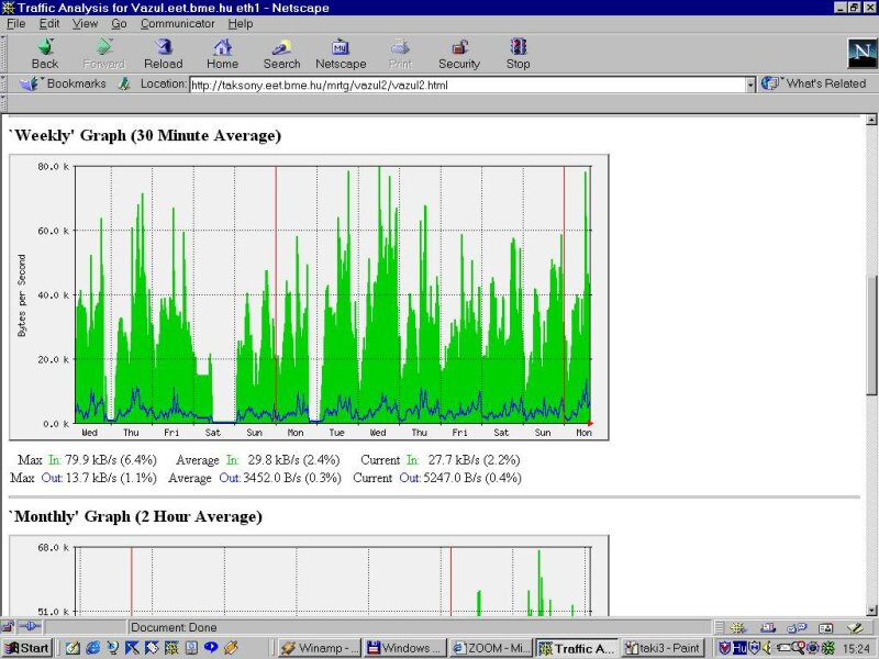 A feladatot én egy már kész és sok helyen bevált program segítségével oldottam meg. A program neve Multi Router Traffic Grapher /MRTG/. Az MRTG routerekhez lett kifejlesztve, de kiválóan alkalmas Ethernet-kártya segítségével bármilyen lokális hálózat /LAN/ monitorozásához is. HTML oldalakat és dinamikus GIF-képeket generál, melyek a forgalmat reprezentálják. Az MRTG-t Perl és C nyelven írták, UNIX és Windows NT rendszerek alatt képes futni. Az MRTG Perl scrtiptet tartalmaz, amely SNMP-t használ, hogy a routerek hálózati számlálóját kiolvassa, továbbá egy gyors C programot, amely naplózza a hálózati adatokat és a monitorozott hálózati kapcsolat forgalmáról grafikonokat készít. Ezeket a grafikonokat weblapokba ágyazza bele, melyek bármely modern webböngészõvel megtekinthetõk. Valamint az utolsó 7 napról, az utolsó 4 hétrõl és az utolsó 12 hónapról is készít statisztikákat. Ez azért lehetséges, mert a MRTG naplót készít minden olyan adatról, amit a routerbõl kiszedett. Ezt a naplót automatikusan rendezi, így az nem nõ túlságosan nagyra, de mégis tartalmaz visszamenõleg két évre minden szükséges adatot. Mindezt hatékony módszerrel állítja elõ. 50 vagy annál több hálózati link monitorozására képes. Az MRTG felhasználhatósága nem kizárólag hálózati forgalom monitorozására korlátozódik, hanem képes bármely SNMP-változót figyelni. Még egy belsõ programot is lehet használni, ami az adatokat gyûjti, és ezt lehet MRTG-n keresztül figyelni. Az emberek az MRTG-t többek között System Loadok, Login Sessionok, hibák és modemhozzáférések monitorozására is használják. Továbbá azt is lehetõvé teszi, hogy kettõ vagy három adatforrást egyetlen grafikonban összegezzünk.
