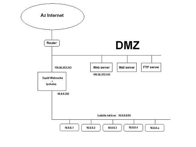 Adott egy vállalat amelynek a belsõ hálózata 10.0.0.0/24 -es tartományból kiosztott ipcímeket használ. A tarományban kb. 40 kliens található, amelyek szeretnék elérni az internetet. Szeretnénk a belsõ hálózatot megvédeni a gonosz crackerektõl. A levelezést és http szervert (DMZ) egy külön géppel oldjuk meg, ez nem témája ezen írásnak. Hogyan csinaljuk ?