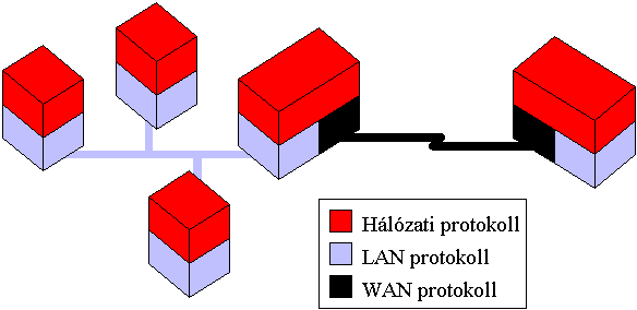 A hálózati protokoll csomagjai egy ideig a LAN keretekben utaznak, utána átkerülnek a WAN csomagjaiba és úgy továbbítódnak a WAN felett. Azt a berendezést, amelyik a csomagokat az egyik fajta hálózatról megkapva a másikra továbbítja, router-nek nevezzük. A router-ek és az állomások, valamint a két router közötti átviteli közeget (legyen az LAN vagy WAN) hívjuk link-nek. Egy link-nek alapvetô tulajdonsága, hogy rajta 2 állomás közvetlenül küldhet egymásnak információkat, egy router közbeavatkozása nélkül. Tehát például egy LAN szegmens, ahol bármely két állomás keretet küldhet egymásnak link-nek tekinthetô, csakúgy, mint a WAN kapcsolat.