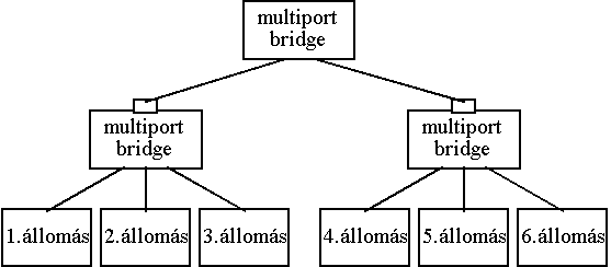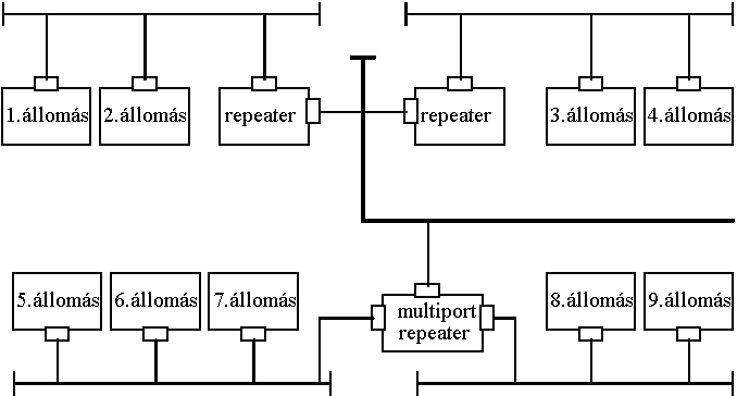 Az Ethernet rugalmasságát növelik az un. repeater-ek (ismétlôk). Ezek az egyik portjukon vett keretet bit-rôl bitre átmásolják a másik portjukra, mintegy meghosszabbítva ezzel az elektromos jellemzôk miatt rövidre korlátozott szegmenst. Több porttal rendelkezô (multiport) repeater-ek használata esetén minden portra átmásoljuk a vett keretet. Természetesen az ütközéseket továbbra is idôben észlelni kell, a jelterjedési idô nem lehet több 64 byte elküldésének idejénél, ezért bármely két állomás között maximum 4 repeater helyezkedhet el, ám a kapott hálózat meglehetôsen szövevényes lehet. A hálózat mérete ezzel a módszerrel 2.5 km-re növelhetô.