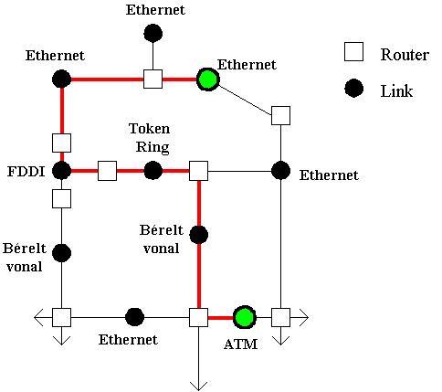 Bár a kapcsolatorientált hálózati protokollok (például X.25 vagy az ATM P-NNI) is tartalmaznak routing elemeket, hiszen a kapcsolat felépítésekor ki kell jelölni az útvonalat, mégis a fogalom elsôsorban a csomagkapcsolt hálózatokra vonatkozik. Egyébként a hívásfelépítéskor történô útvonalkiválasztás során ugyanazokkal a megoldandó feladatokkal nézünk szembe, mint egy csomagkapcsolt hálózatban, fejtegetésünket ezért elsôsorban a csomagkapcsolt hálózatok (ezen belül is az Internet) szem elôtt tatásával folytatjuk.
