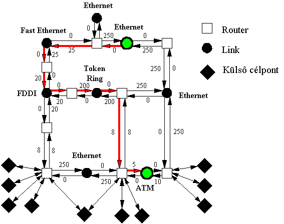 A multipath routing alatt két lehetôséget értük. Az egyik esetben csak akkor osztjuk meg a forgalmat több útvonal között, ha holtversenyben a legolcsóbbak. A második esetben a forgalom egy részét olyan útvonalra engedjük, amelyik nem a legolcsóbb, de még elfogadható. Mindkét megoldás esetén kisebb lesz a csomagok késleltetésének ingadozása, a több útvonal miatt az effektív sávszélesség is nagyobb és az egyik például a legolcsóbb útvonal kiesése esetén a forgalom mintázata nem annyira ugrásszerûen változik meg, hisz a csomagok egy része eddig is más útvonalon haladt.