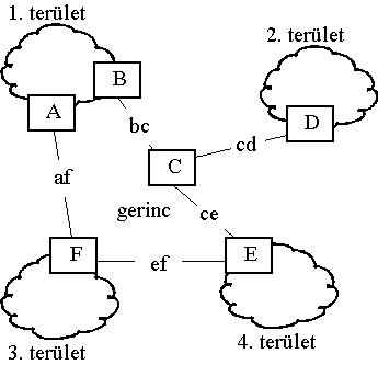 A fenti ábrán például a B router összegzi az 1. területen található összes link tôle való távolságát és ezt az információt a gerinc-területen belül a Flooding protokoll segítségével elterjeszti. Az E router az így megismert költségekhez hozzáadja a bc és a ce link-ek költségét és így terjeszti a 4. terület belsejében a Flooding protokoll segítségével. Ugyanezt az információt megkapja az A router-tôl is az af és ef link-eken át, ebben az esetben az 1. terület minden célpontjához 2 útvonal áll rendelkezésre, az egyik az A, a másik a B router-en át. Itt a distance-vector eljáráshoz hasonlóan a kisebbet választjuk és terjesztjük. Nem áll fenn azonban a hurok kialakulásának veszélye, hisz a területeken és magán a gerincben is egy link-state algoritmus választ utat, a distance-vector elem pedig egy teljesen hierarchizált helyzetben lép be: a csomag föllép egy területrôl a gerincre, majd onnan a cél-területbe lép. Itt hurok ki nem alakulhat.