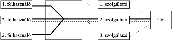 Mind a 3 felhasználó és mind a 3 távolsági szolgáltató a regionális gerincre csatlakozik. Ha egy bizonyos célpont felé mind a 3 szolgáltató ismer utat, akkor a regionális gerincnek választania kell az adott cél felé egy szolgáltatót, amit a felhasználók felé terjeszt. Ez valószínûleg a legkisebb költséget reklámozó szolgáltató lesz, mondjuk a 2.