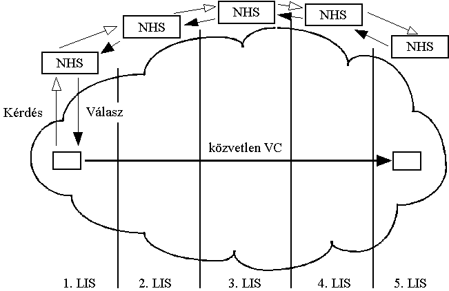 A másik üzemmódban az NHS-ek egy routing protokollt is futtatnak és ennek segítségével határozzák meg, hogy a keresett célállomás merre található és abba az irányba adják tovább a kérdést. Alapvetôen abból indulnak ki, hogy a célpont felé útba esik a célpontot kiszolgáló NHS is, aki majd képes lesz megmondani az ATM címet. A routing protokoll segítségével tehát a kérelem elhatol a célpontot kiszolgáló NHS-ig, a válasz pedig visszafelé ugyanazon az úton érkezik, így az NHS-ek is eltárolhatják a választ, hogy legközelebb maguk is válaszolhassanak a kérdésre. A visszaérkezett választ a kezdeti NHS aztán eljuttatja a kérdezôhöz. A kérdezô pedig kiépítheti a közvetlen VC-t a célponthoz még akkor is, ha nem ugyanabban a LIS-ben vannak (nem ugyanaz az NHS szolgálja ki ôket).