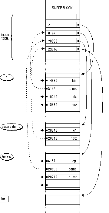 A rendszer először megkeresi a gyökér katalógus inode-ját, ez a második inode (#2). Az inode rekordból kikeresi, hogy a lemezen fizikailag hol helyezkedik el maga a / katalógusfájl, ami a gyökérkatalógusban lévő fájlok nevét adja meg. Megnyitja e katalógust, megkeresi benne a users bejegyzést, megnézi az ahhoz tartozó inode számot (#8194), ezt indexként használva az inode táblában megkeresi a /users katalógusra vonatkozó bejegyzést is. Az ebben az inode-ban tárolt adatok alapján megkeresi a lemezen a /users katalógusfájlt, megnyitja, és megkeresi benne a demo bejegyzést, az ahhoz tartozó inode szám (#20699) alapján az inode táblában megkeresi a megfelelő bejegyzést, kiolvassa belőle a /users/demo katalógusfájl helyét, megnyitja a katalógust, megkeresi benne a text fájlra vonatkozó bejegyzést, a hozzátartozó inode szám (#20816) alapján megkeresi az inode-ot, és annak alapján megnyitja a tényleges fájlt.
