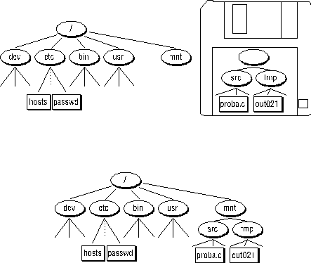 Mire jó a szimbolikus link? Legfontosabb előnye az, hogy lehetővé teszi különböző fájlrendszerek közti láncolást. Ennek megértéséhez néhány szóval meg kell említeni a UNIX fájlrendszer egy érdekes tulajdonságát, mégpedig a mountolhatóság fogalmát. A UNIX fájlrendszere, ahogy azt a felhasználó szerves egésznek látja, nem feltétlenül egységes fizikai szinten is. Ha például több merevlemez van a gépben, ezeken külön-külön UNIX fájlrendszerek vannak installálva, hasonlóképpen, egy CD-n, vagy egy floppy diszken is. Mountolásnak hívják azt a tevékenységet, amikor egy ilyen különálló fájlrendszert becsatolunk egy már meglévőhöz. A 7.ábrán egy olyan példát mutatunk be, ahol egy floppyn lévő UNIX-os fájlrendszert csatolunk be a gazdagép UNIX fájlrendszerébe, a /mnt katalógus alá. A továbbiakban a floppyn lévő fájlrendszer gyökérkatalógusa a /mnt hivatkozással érhető el, a floppyn lévő /src katalógus /mnt/src néven és így tovább. Magáról a mountolásról több szót nem ejtünk, mert a kérdés leginkább a rendszeradminisztrátorokat érinti, a felhasználó szempontjából a becsatolás észrevehetetlen kell hogy legyen. A fentiek annyiban érdekesek a számunkra, hogy merev láncolást nem lehet két különböző mountolt fájlrendszer között létrehozni. A linkelés mechanizmusa ugyanis arra épül, hogy az inode-ok egy állományrendszeren belül egyértelműen azonosítják a fájlokat, azaz ugyanazon inode-ra történő hivatkozás ugyanazt a fájlt jelenti. Mivel azonban minden egyes önállóan becsatolható fájlrendszerben független a számozás (mindegyikben 2 a root inode stb), az inode érték önmagában nem nyújt elégséges információt arra nézve, hogy a keresett fájl a teljes állományrendszerben hol található. Ezért ha fájlrendszerek közti láncolást próbáltunk meg, az alábbi, vagy hasonló értelmű hibaüzenetet kapunk: