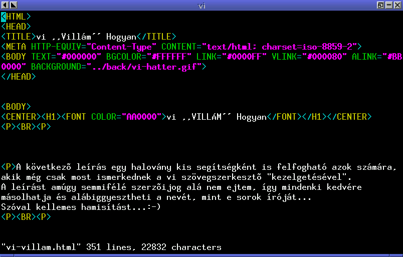 Jó kérdés. Állítólag a "visual editor" rövidítése. A vi alapanyaga az "ex" (extended editor) nevű sorszerkesztőből (ilyen például az "ed" is) ered. Bill Joy - az ex kitalálója - később írt egy képernyő-alapú felhasználói felületet az ex-hez és ezt elnevezte vi-nak. Mivel ez a kis tanmese a vi-ról szól és nem az ex-ről, ezért ha az ex-vel bővebben szeretnél megismerkedni, akkor csak gépeld be: ex (ez általában hatásos szokott lenni:-)