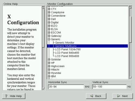 A telepítő program természetesen itt is segítségünkre van. Amennyiben valamilyen márkás monitorunk van, akkor azt a telepítő program fel fogja ismerni (pl. EIZO F56) és ismeri a monitor paramétereit. Ha a monitorunk nem található meg a telepítő listájában, akkor válasszuk a „Generic Monitor”, vagy „Generic Multisync” monitort. Ezek a beállítások a mai modern monitoroknál általában megfelelőek.