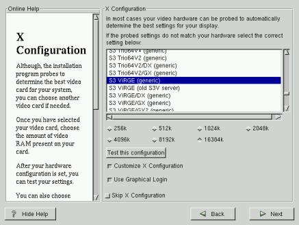 Ha a monitort kiválasztottuk, akkor telepítő a VGA kártyánkat fogja megkeresni. Célszerű nem a legújabb kártyatípusokat használni, mivel egyelőre az a gyakorlat, hogy a VGA kártyagyártók nem készítenek Linux eszközmeghajtókat kártyáikhoz, és nem adják ki a kártyák adatait sem, ezért eltelik egy kis idő, amíg a lelkes programozók elkészítik a megfelelő programokat. Ha a sikerült felismernie a VGA kártyát, akkor szerencsénk van. Ellenkező esetben megpróbálhatjuk magunk kiválasztani a megfelelő kártyát a listából. A lista alatt látható értékek a VGA kártyán található memóriára utalnak. Valószínű, hogy ezt magunknak kell kiválasztani.