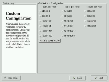 A harmadik alapvető dolog, amit be kell állítanunk, az a színmélység és a felbontás. Pontosabban ezekből többet is beállíthatunk. Az X Window lehetőséget ad arra, hogy használata közben bármikor átkapcsolhassunk a különböző felbontások és színmélységek között a CTRL+ALT és a számbillentyűzet + vagy – gombjainak együttes lenyomásával. Azt is érdemes tudni, hogy ha bármilyen probléma miatt használhatatlanná válik az X Window grafikus környezet, de az operációs rendszer még működik, akkor kiléphetünk belőle a karakteres környezetbe a CTRL+ALT+BackSpace gombok együttes lenyomásával.