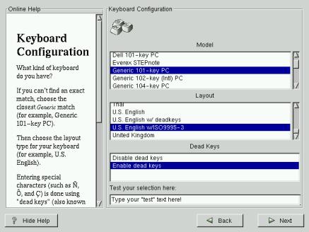 A billentyűzet beállítása, bár még a hivatalos kezdet előtt van, már része a telepítésnek. Ez az a pont, ahol a telepítő program beállítja a telepítés alatt, és a Linux karakteres felületén induláskor használt kódtáblát. Ez fontos, pl. a jelszavaknál, mert az angol és a magyar karakterkészletben több eltérés van és a jelszó beírásakor ez nem látszik.