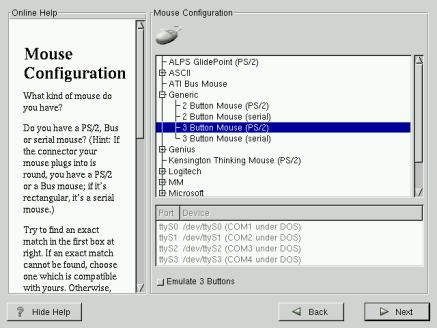 Az egér beállítása szintén megelőzi a hivatalos kezdést, de igazából csak azt kell már beállítanunk, hogy 2 vagy 3 gombos egerünk van-e, ugyanis az egeret a Linux telepítőprogramja már detektálta, mielőtt a GUI-t elindította. A Linux bizonyos programja az egér középső gombjának használatát is megengedik, amely 2 gombos egér esetén emulálható a két gomb együttes lenyomásával. Ezt a funkciót is itt kell beállítani.