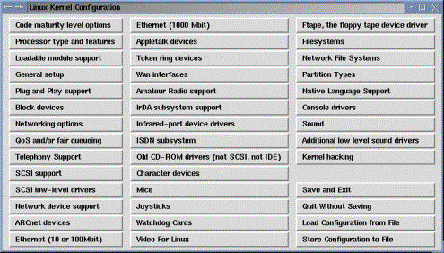 A kernel beállításához először a „/usr/src/linux” könyvtárba kell mennünk, ahol egy make paraméter utasítást kell kiadni. Itt a paraméter azt mondja majd meg, hogy melyik konfigurációs felületet választjuk a lehetőségek közül. A kernelt a legegyszerűbben a make xconfig utasítással állíthatjuk be. Ez egy grafikus felületű konfiguráló program, amely jól áttekinthető és könnyen kezelhető. (Használhatjuk még a make menuconfig utasítást is karakteres felületen). A kernel egyes paramétereinél általában igen „y”, nem „n”, vagy modulba „m” választ adhatunk.