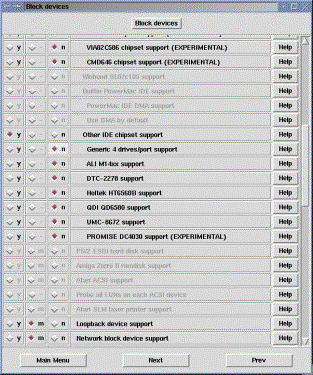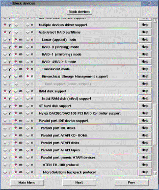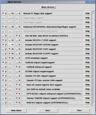 A Blokk eszköz meghajtók konfigurálásához érkeztünk. Blokk eszköz az, amely egy adott blokkot olvas be egyszerre, nemcsak egy bájtot. Ezek az eszközök elsősorban tároló eszközök (pl. floppy, cd, hdd). Most nagy hasznát vesszük a számítógépről készített hardver listának, amelyben megnézhetjük, hogy milyen blokk eszközeink vannak a gépben. Célszerű a floppyt kihagyni az éles kernelből, ha nincs rá feltétlenül szükség, mert ezzel egy támadási felületet szüntethetünk meg. Csak azokat az eszköztámogatásokat fordítsuk bele a kernelbe, amelyek kellenek a boot-oláshoz, a többit fordíthatjuk modulba.