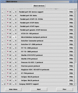 · Enhanced IDE/MFM/RLL disk/cdrom/tape/floppy support – Az IDE (illetve EIDE) eszközök közül azokra válaszoljunk igennel, amelyek vannak a gépben. (Ha csak SCSI eszközöket használunk, akkor ezek elhagyhatók, de csak akkor). Ha van IDE szalagos eszközünk, akkor azt válasszuk modulba, mert nem kell a boot-oláskor.