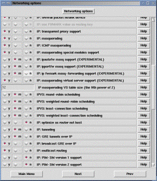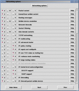 A hálózati opciókban azt állíthatjuk be, hogy milyen hálózati elemeket támogasson a kernel. A kernel a TCP/IP-n kívül több hálózati protokollt is támogathat (pl. IPX), de pillanatnyilag ezek nem érdekesek számunkra.
