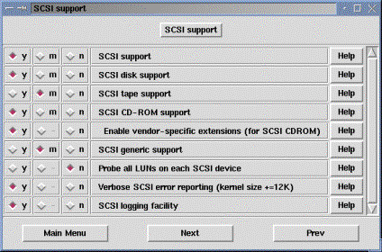 · SCSI disk support – Ha van SCSI merevlemezünk, és azt boot-olásra használjuk, akkor azt fordítsuk a kernelbe, válasszuk az igent „y”.
