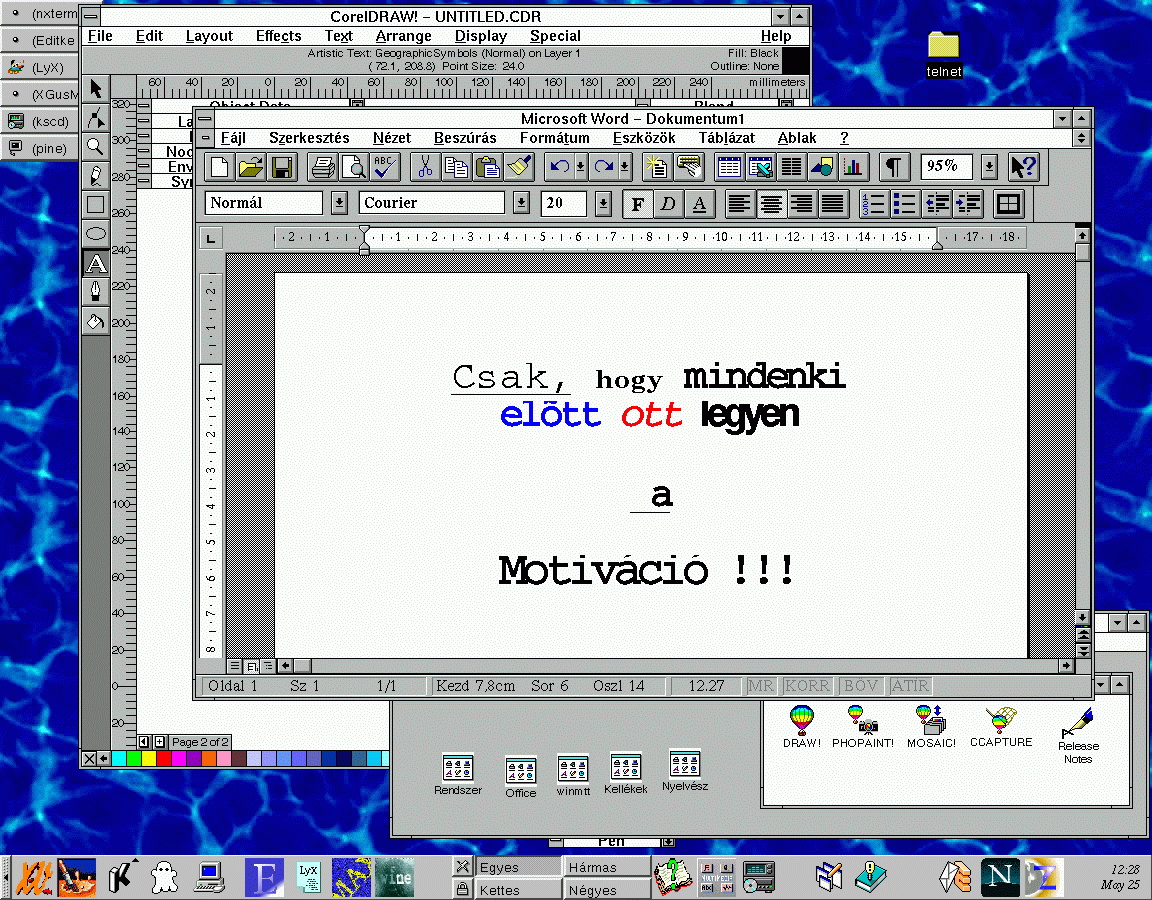 A Word 6.0 telepítését pontosan úgy végezzük, ahogyan általában a telepítés történik a Windows-ban, azaz File->Futtat->Tallóz...stb. Ha CD-ről telepítjük, akkor azért előtte mountoljuk root-ként (vagy ha erre jogunk van sima user-ként). Floppy-ról pedig mount..umount..mount...umount..:-)..és szépen felmegy. Ha esetleg az első indításnál elszáll, akkor a jelzett file-okat másoljuk az adott helyre, de ez nem jellemző.....(gondolom én :-)